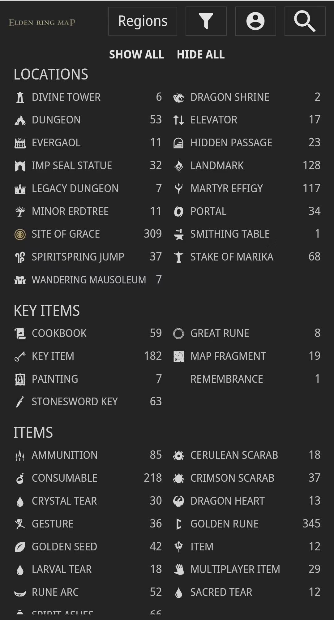 You can find everything in this Elden Ring interactive map